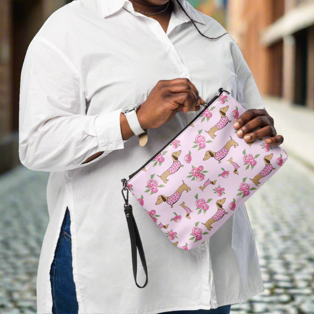 Show off your love for long dogs with this doxie-chic crossbody bag. Featuring our exclusive dachshund print—adorable sausage dogs strutting in pink heart sweaters, surrounded by peony blooms—this bag is paw-fect for wiener dog moms.